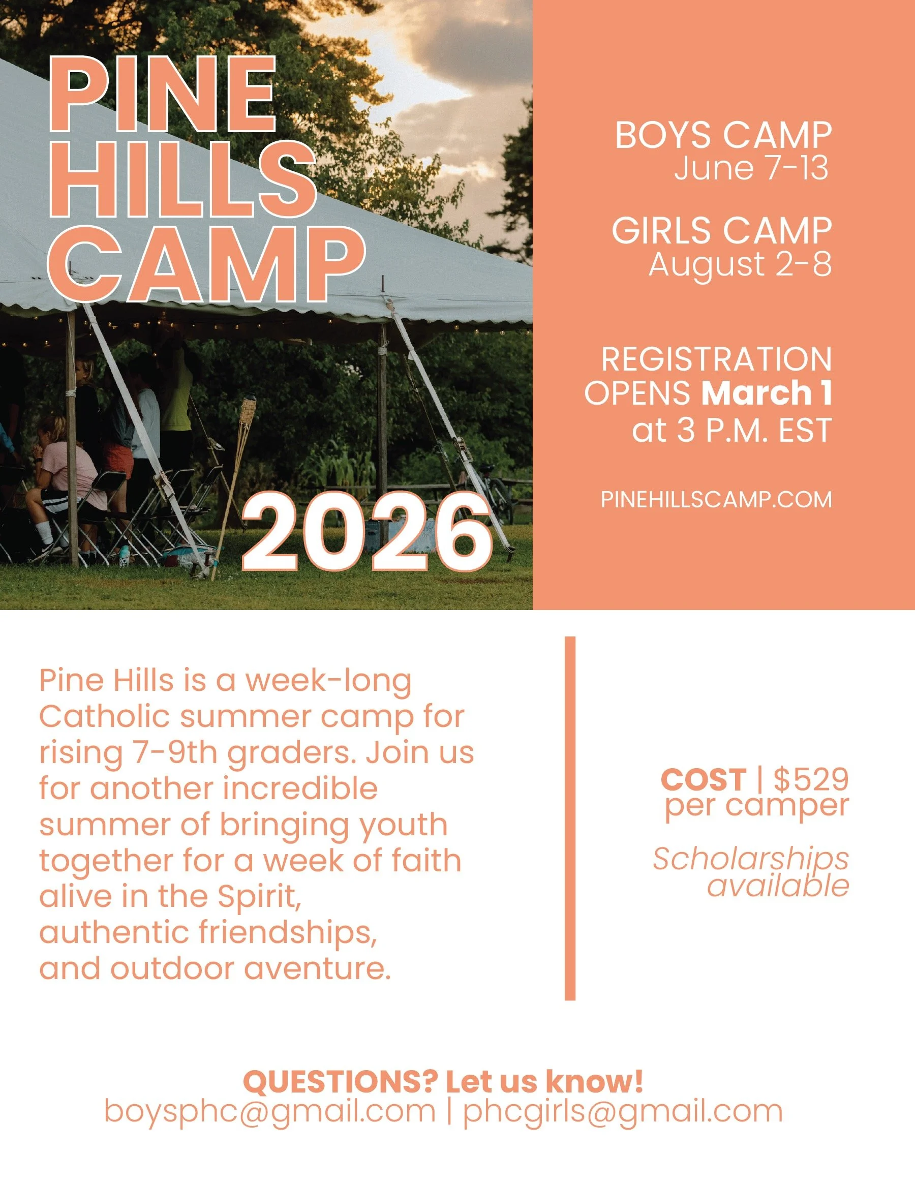 Pine Hills is a week-long Catholic summer camp for middle schoolers sponsored by Renewal Ministries. Each year, the boys’ and girls’ camps bring youth together for a week of faith alive in the Spirit, authentic friendships, and outdoor adventure.